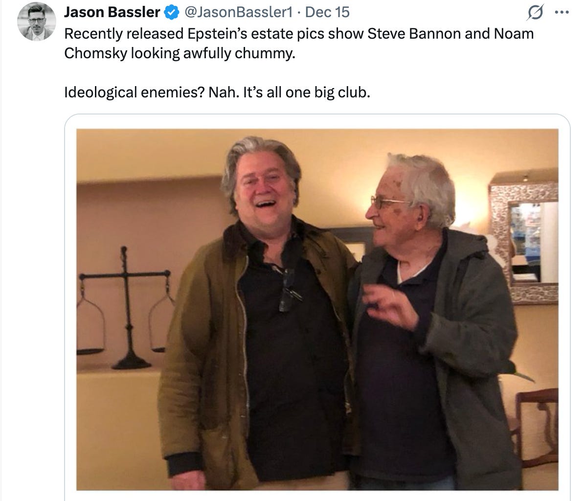 Recently released Epstein’s estate pics show Steve Bannon and Noam Chomsky looking awfully chummy.