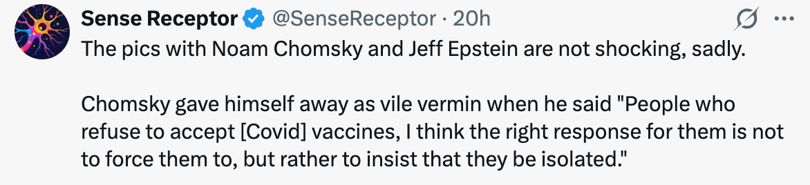 Chomsky gave himself away as vile vermin when he said “People who refuse to accept [Covid] vaccines, I think the right response for them is not to force them to, but rather to insist that they be isolated.” pic.twitter.com/sN8uNakGj7