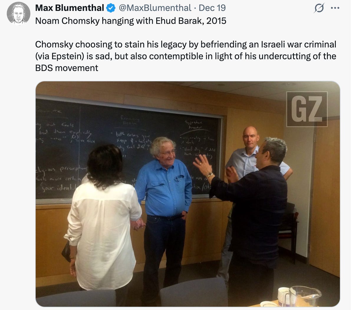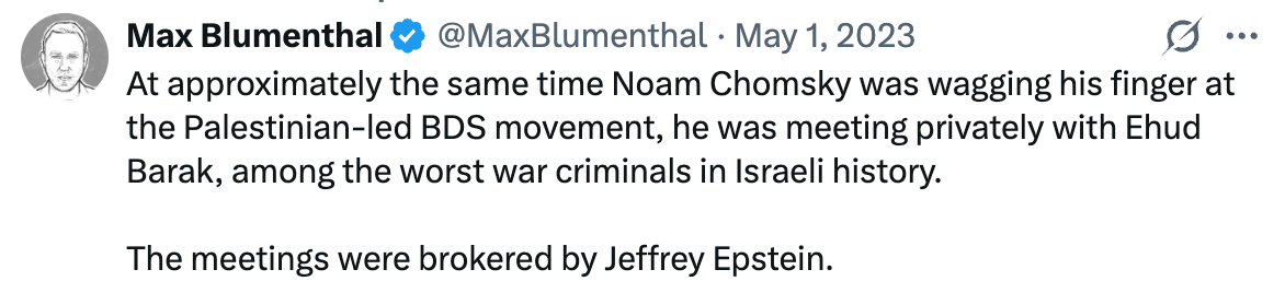Chomsky choosing to stain his legacy by befriending an Israeli war criminal (via Epstein) is sad, but also contemptible in light of his undercutting of the BDS movement pic.twitter.com/Bssk2aYyR0