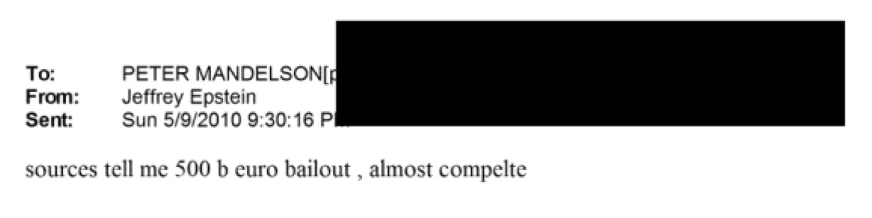 On May 9, Epstein emailed Mandelson: “any closer.” Mandelson replied from his BlackBerry: “Only to oblivion. GB now having ‘secret’ talks with Clegg in Foreign Office..”(EFTA02425507) Epstein wrote back: “sources tell me 500 b euro bailout, almost complete.” (EFTA02031332) Later that evening, Mandelson texted: “Sd be announced tonight.” Then: “Just leaving No10..will call.” (EFTA02425165)