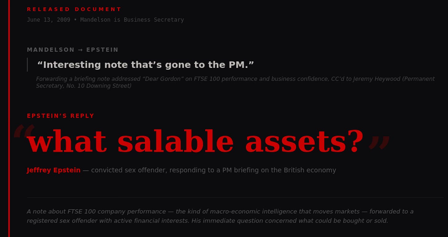 Epstein’s response is notable. A note about FTSE 100 company performance and business confidence—the kind of macro-economic intelligence that moves markets—was forwarded to a registered sex offender with active financial interests, and his immediate question concerned what could be bought or sold on the basis of it. The exchange demonstrates the transmission of contemporaneous government information to Epstein, who responded with financially oriented questions.