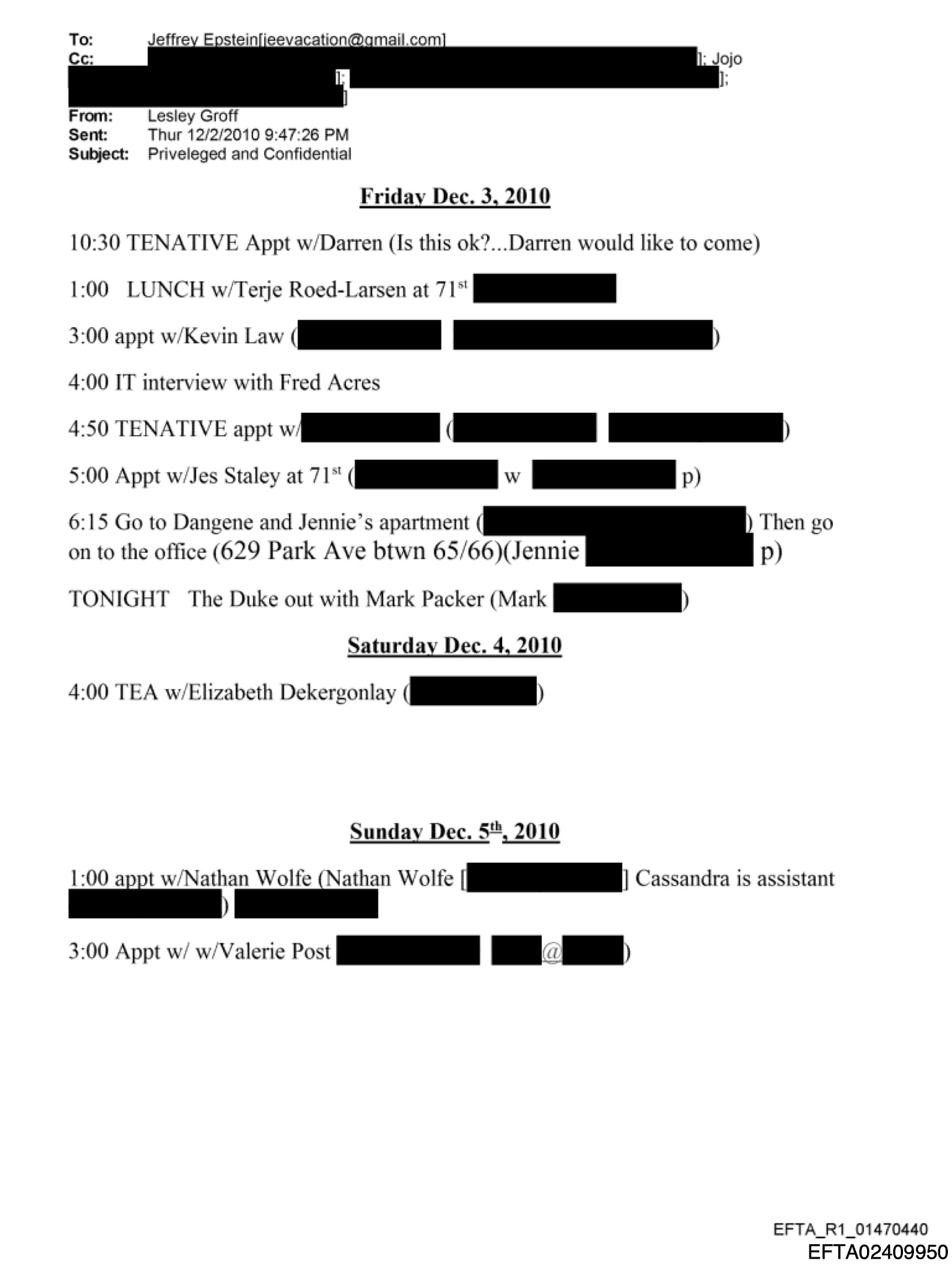 In the same correspondence, Epstein conducted what reads as contingency planning for Rothschild’s personal and financial affairs. He wrote: “If something were to happen to you… who do i call? who is in charge… bank, family… money, things… your assst? cynthina? henri? mom, brother… the executor of your will?? (who). main doctor?… who defends lawsuits nadine. etc.”
