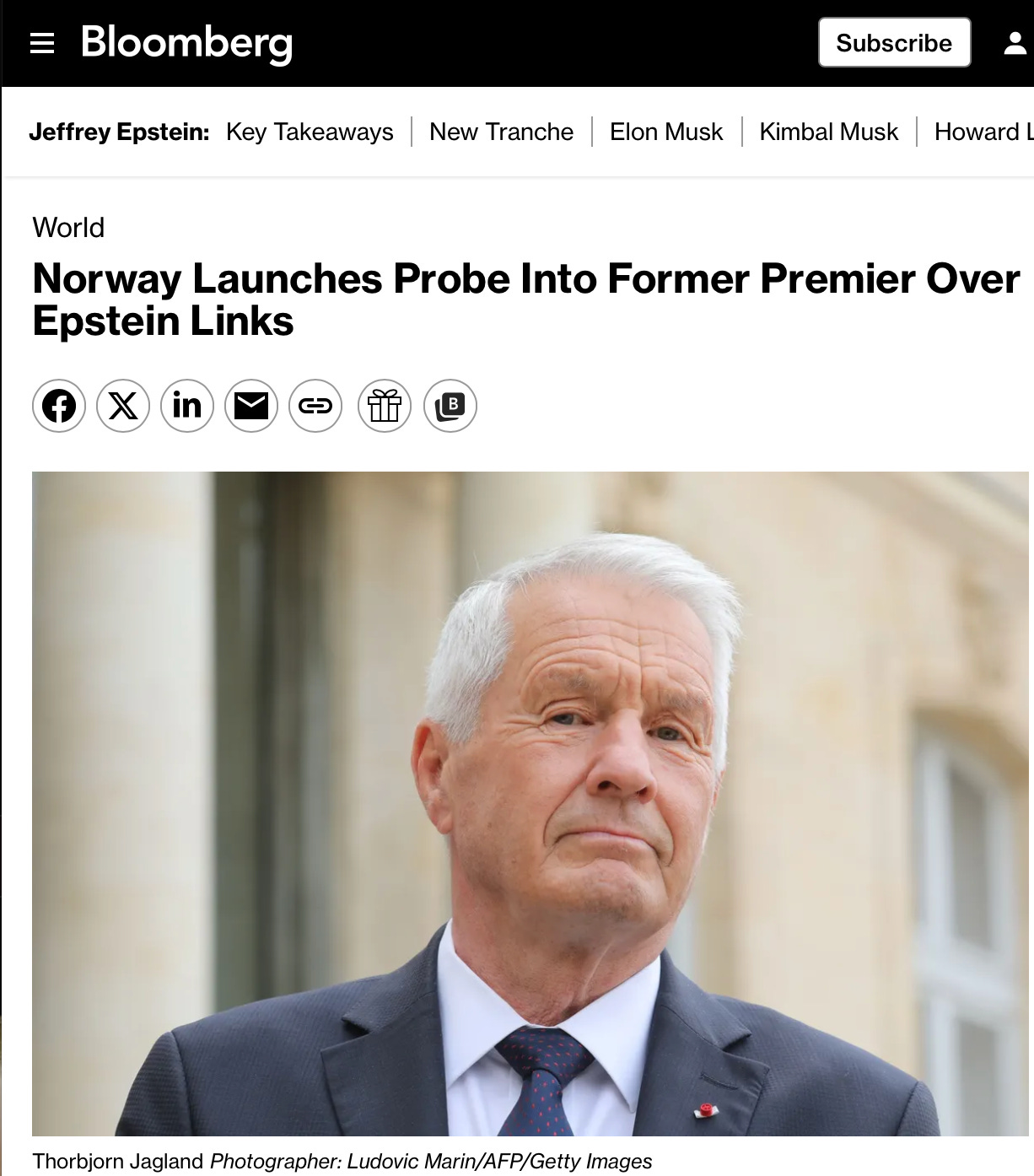 On February 6, 2026, following the DOJ’s release of approximately three million pages under the EFTA, Norway’s Økokrim—its dedicated economic crimes prosecution unit—opened a criminal investigation into former Prime Minister Thorbjørn Jagland on suspicion of aggravated corruption linked to Epstein. (ER: The application of EO 13818 against global corruption and crimes against humanity, much earlier, could have taken out Jagland already.) The released documents showed that Jagland had planned a family trip to Epstein’s island in 2014, stayed at Epstein’s properties in New York and Paris in 2015 and 2018, and asked Epstein for financial assistance to purchase a home. On February 11, 2026, the Council of Europe’s Committee of Ministers unanimously waived Jagland’s diplomatic immunity, clearing the way for prosecution—the first time the institution has revoked a former leader’s protections. Norway’s former ambassador to Jordan resigned after reports that Epstein left $10 million to her children in a will drawn up shortly before his death. The head of the World Economic Forum, Norway’s former foreign minister Borge Brende, faces investigation by a WEF risk committee over his documented dinners and communications with Epstein.