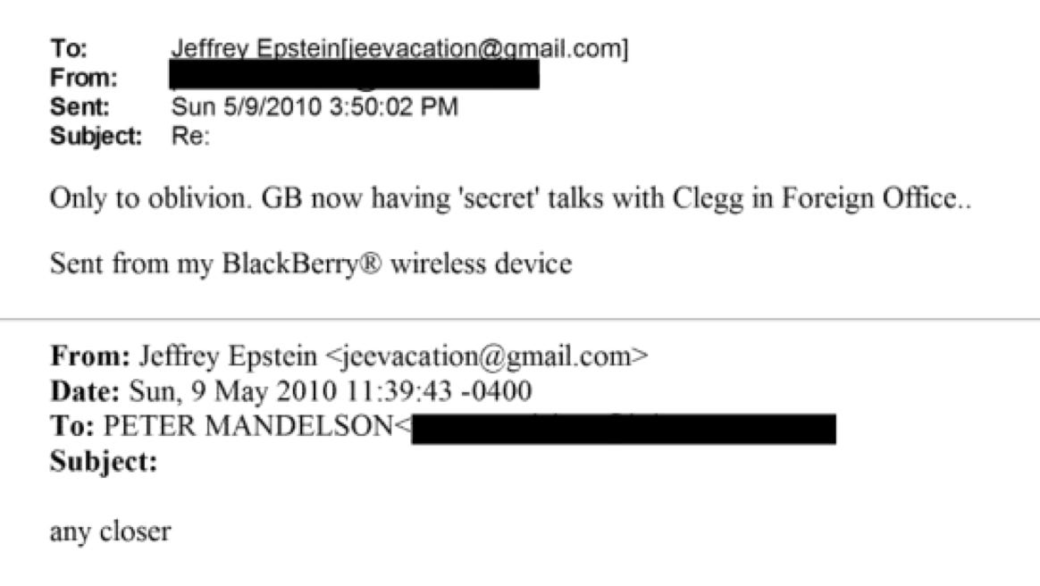 The next morning, May 10, Epstein emailed Mandelson: “??” Mandelson replied: “Finally got him to go today…”—a reference to Brown’s resignation as Prime Minister later that day. (EFTA00759936) Mandelson then provided further detail: “Including the underground walk from no10 to the Ministry of Defence with GB for secret late night talk with Libs..” Epstein’s response: “i have faith, the value of some chapters in your book should now increase.” (EFTA00892100)
