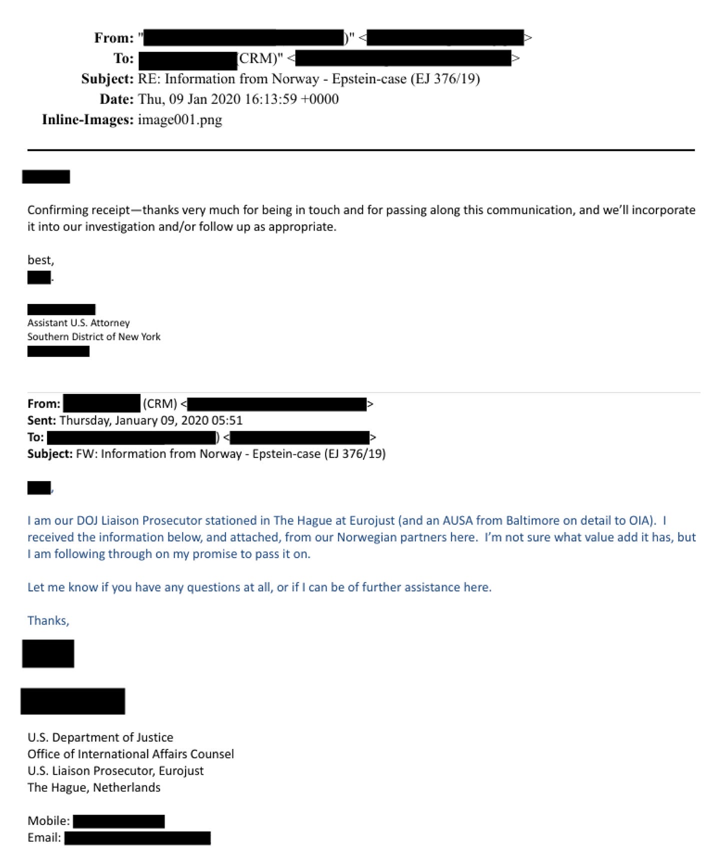 The DOJ Liaison Prosecutor stationed at Eurojust—an Assistant U.S. Attorney from Baltimore on detail to the Office of International Affairs—forwarded the information to the SDNY. On January 9, 2020, an Assistant U.S. Attorney in the Southern District confirmed receipt: “We’ll incorporate it into our investigation and/or follow up as appropriate.”
