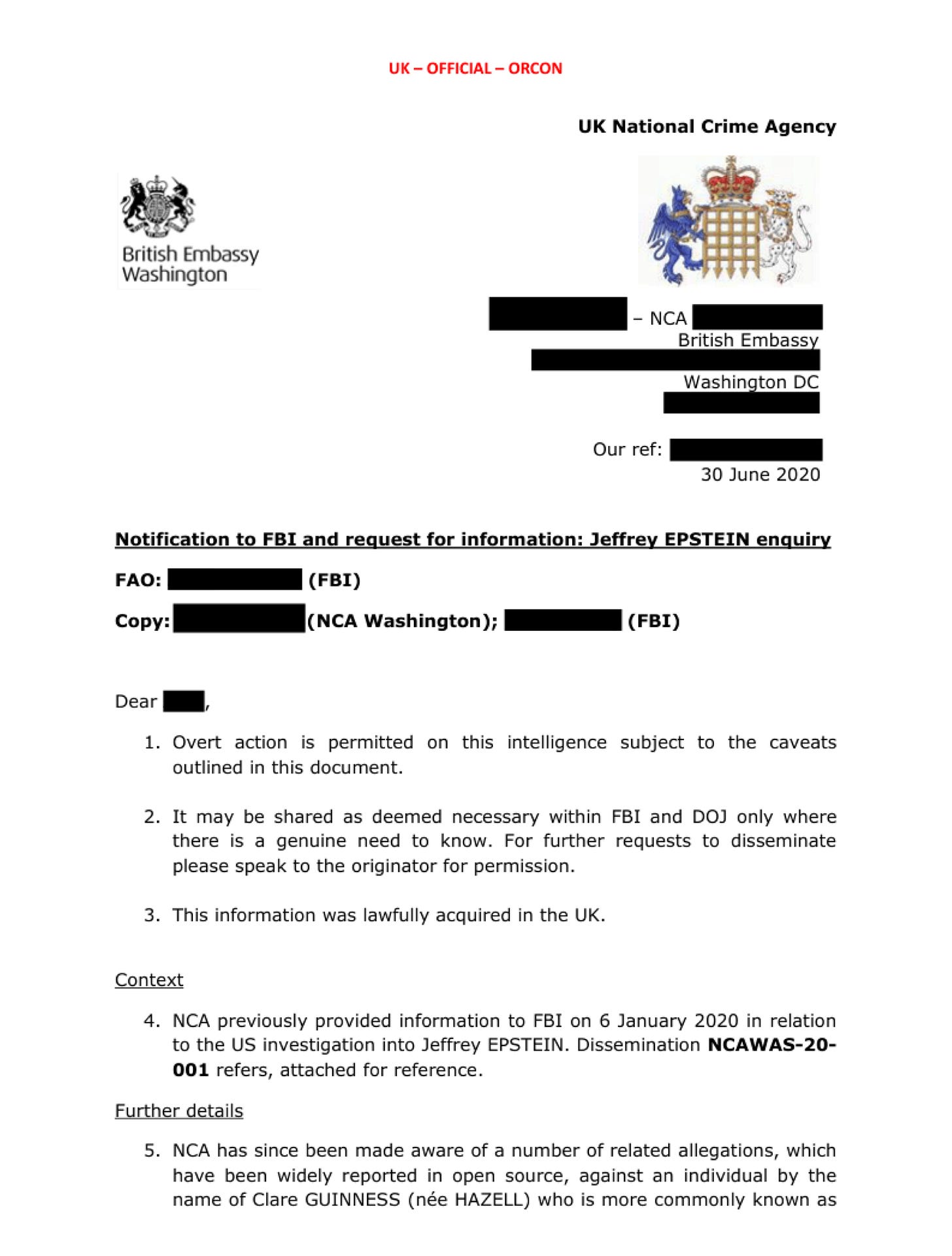 The United Kingdom’s National Crime Agency operated a classified intelligence channel from the British Embassy in Washington to the FBI, transmitting intelligence on Epstein’s British connections, beginning no later than January 2020 and continuing through at least September 2020.