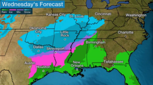 The storm will spread snow across Oklahoma and northern Texas into Arkansas,Missouri, and the Ohio Valley by Wednesday. Freezing rain and sleet could impede travel on major interstates in central and eastern Texas into northern Louisiana and the Lower Mississippi Valley. By evening, snow will spread to the Ohio Valley, central Appalachians and mid-Atlantic.