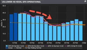 However, after this weekend, there is good news – heating degree days for the US appear to return to normal levels, which means warmer temperatures are ahead that will decrease energy demand usage.