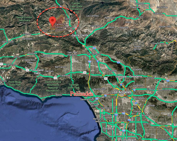 Cal Fire reports that the Canyon Fire, which erupted yesterday afternoon near Piru, Ventura County, has exploded in size from 30 acres to 4,856 acres by early Friday morning, with 0% contained.