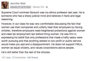 Now some of his former students have raised concerns about Gorsuch’s views on discrimination against female workers. Jennifer Sisk, who graduated from the University of Colorado Law School last year, says that during a Legal Ethics and Professionalism class last spring, Gorsuch told his students that companies should ask women about their pregnancy plans during job interviews, and claimed that many women plan to manipulate their employers by taking maternity leave, then quitting to stay home with their children.