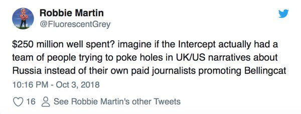 Thus, while The Intercept has long publicly promoted itself as an anti-interventionist and progressive media outlet, it is becoming clearer that – largely thanks to its ties to Omidyar – it is increasingly an organization that has more in common with Bellingcat, a group that launders NATO and U.S. propaganda and disguises it as “independent” and “investigative journalism.”