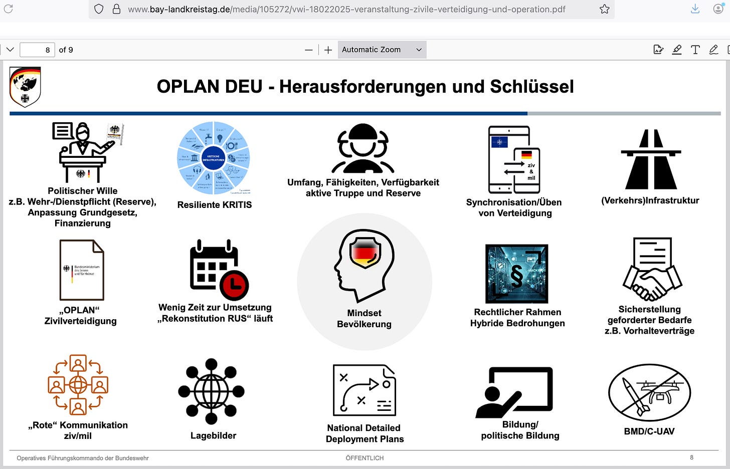 The final stage of OPLAN DEU, the implementation of security measures, is planned for spring 2026. By then, at the latest, citizens will likely also be updated on the new situation [that means, likely, that an escalatory number of psy-ops is going to be deployed from now till then].