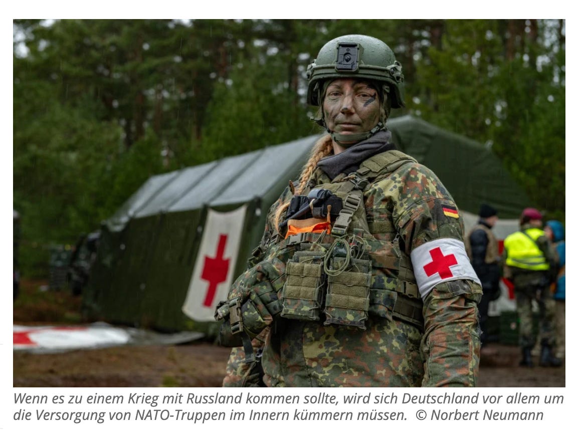 In this case, the Federal Republic will become the ‘Transport Hub Germany’—the logistics center, so to speak, for armies from France, England, and North America [lol, let’s remind everyone that France has 270K active-duty personnel and no conscription (2021, via Wikipedia), Britain has 140K active-duty personnel and no conscription (2025, via Wikipedia), and, yes, the US 1.33m active-duty forces (via Wikipedia, 2021)—and consider the fact that while we laugh about Germany’s lack of military readiness and its inability to quickly create large, deployable units—the same is true of these three countries; in the case of the US, the logistical nightmare of moving, and subsequently supplying, large armies across the Atlantic shall be noted]. ‘NATO’s plans call for continuous logistical and medical support for several hundred thousand soldiers’, it states. ‘Maximum civilian support is…a decisive factor.’ So what are we in for? [that’s a fair question, even if one sets aside the pithy state of emergency care units during the Covid Mania to serve as certainly illuminating insights into the shape of things to come when thousands of casualties arrive each day…will we get dancing nurses and doctors wearing combat-themed (camouflaged) face masks?]