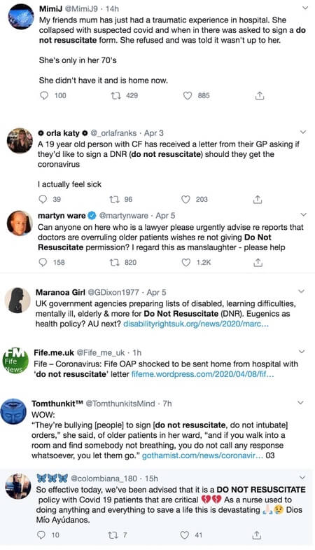 On the topic of the Do Not Resuscitate (DNR) forms being handed out like sweets/candy to the elderly and disabled in the UK, see this personal story from journalist Damian Wilson for RT titled Doctors are sending out ‘do-not-resuscitate’ forms telling people like my disabled daughter to sign them, I find that chilling.