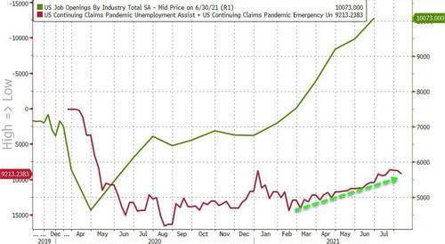 As we noted last week, when the ARP was passed, extending pandemic-related unemployment until today, nearly 14 million Americans depended on the programs, while job openings continued to soar.