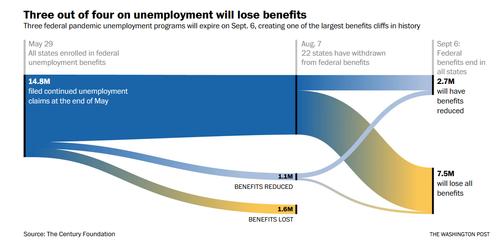 According to the Century Foundation, 7.5 million workers receiving two federal unemployment assistance programs will be cut off from aid, Axios reports. Additionally, nearly 3 million people will lose a $300 weekly boost to their state unemployment benefits.