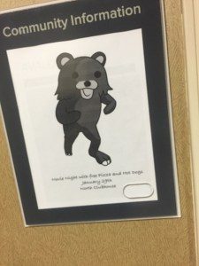 A private investigation into Oakwood’s compound and its employees does nothing but reinforce the notion that it is an utterly inappropriate venue for children. On January 23rd, 2017, a private citizen entered the public spaces of the compound at Oakwood and posted photos of the interior to online message board 4chan. He confirmed Yelp reports that the northern compound appeared to be mainly abandoned by Oakwood staff. A number of the photos show imagery openly posted around the buildings at Oakwood which make direct reference to pedophilia. Visible near elevators and the apartment’s mailboxes are “Community Information” flyers depicting Pedobear, a well known internet meme which is used to reference pedophilia and child abuse.