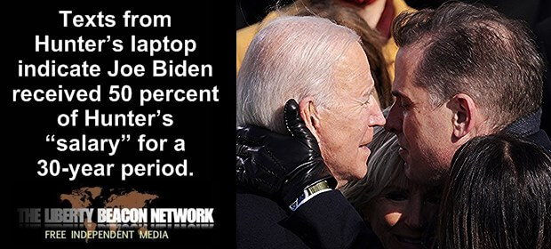 But texts from Hunter’s laptop indicate Joe Biden received 50 percent of Hunter’s “salary” for a 30-year period. The reported texts do not reveal when the 30 years began or ended and whether Joe Biden is still a part of the payment scheme as president.