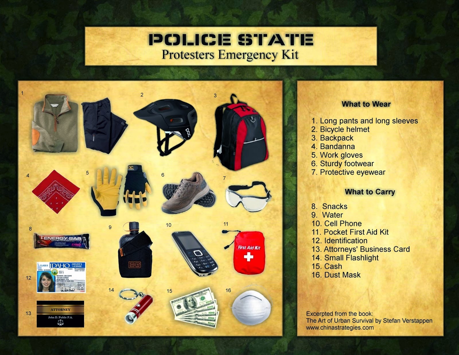 The riot police typically carry a lot of gear and it is a good idea for you to carry some items on your person as well.