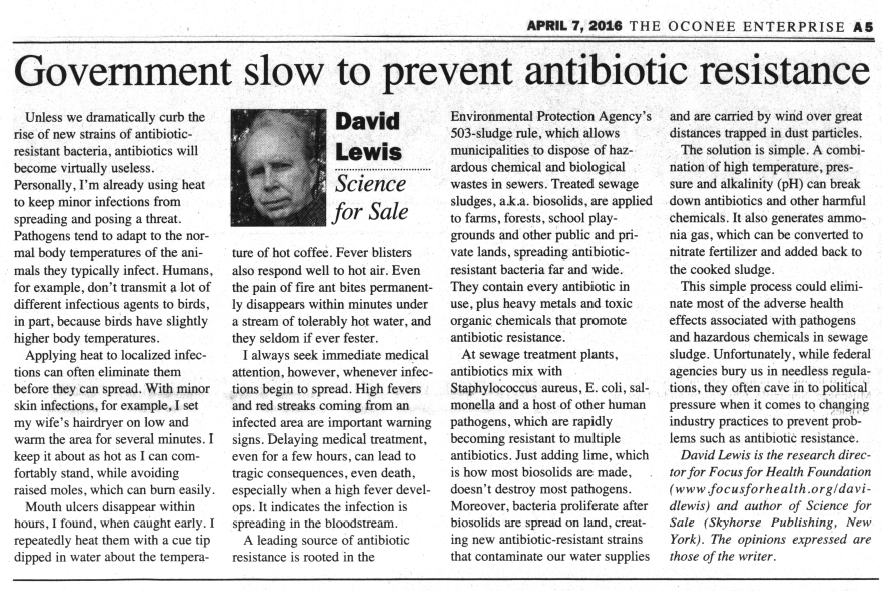 The solution is simple. A combination of high temperature, pressure and alkalinity (pH) can break down antibiotics and other harmful chemicals. It also generates ammonia gas, which can be converted to nitrate fertilizer and added back to the cooked sludge. This simple process could eliminate most of the adverse health effects associated with pathogens and hazardous chemicals in sewage sludge. Unfortunately, while federal agencies bury us in needless regulations, they often cave in to political pressure when it comes to changing industry practices to prevent problems such as antibiotic resistance.