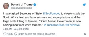 Trump said he asked Secretary of State Mike Pompeo to study South African “land and farm seizures” and “killing of farmers”…