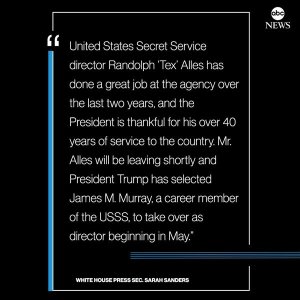 NEW: “Mr. Alles will be leaving shortly and President Trump has selected James M. Murray, a career member of the USSS, to take over as director beginning in May,” White House says. https://t.co/3yS8Wf5Ody pic.twitter.com/FYbLVMwWt7