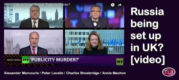This excellent 25 minute video by RT – Peter Lavelle’s Crosstalk with guests Alexander Mercouris, Charles Shoebridge and Annie Machon – provides an excellent update on the critical issues to do with the Skripal poisoning case in the UK and why the whole affair seems highly implausible as it is being represented by the UK government.