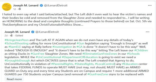 No sooner as LEO boots on the ground just began the Apalachee School (about an hour north-east of Atlanta) in Winder Georgia shooting investigation and The Left was at it again… So, to start this piece, I am going to start with my social-media response to #KringeJeanPeon and #kamELE (Extinction Level Event, if elected POTUS)…