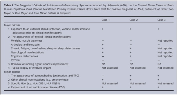 These cases are then compared with the newly-described syndrome, autoimmune/inflammatory syndrome induced by adjuvants (ASIA), which can be characterized by the existence of several criteria. All of the girls fit the definition. Following is a copy of the table that displays which of the symptoms each young woman suffered: