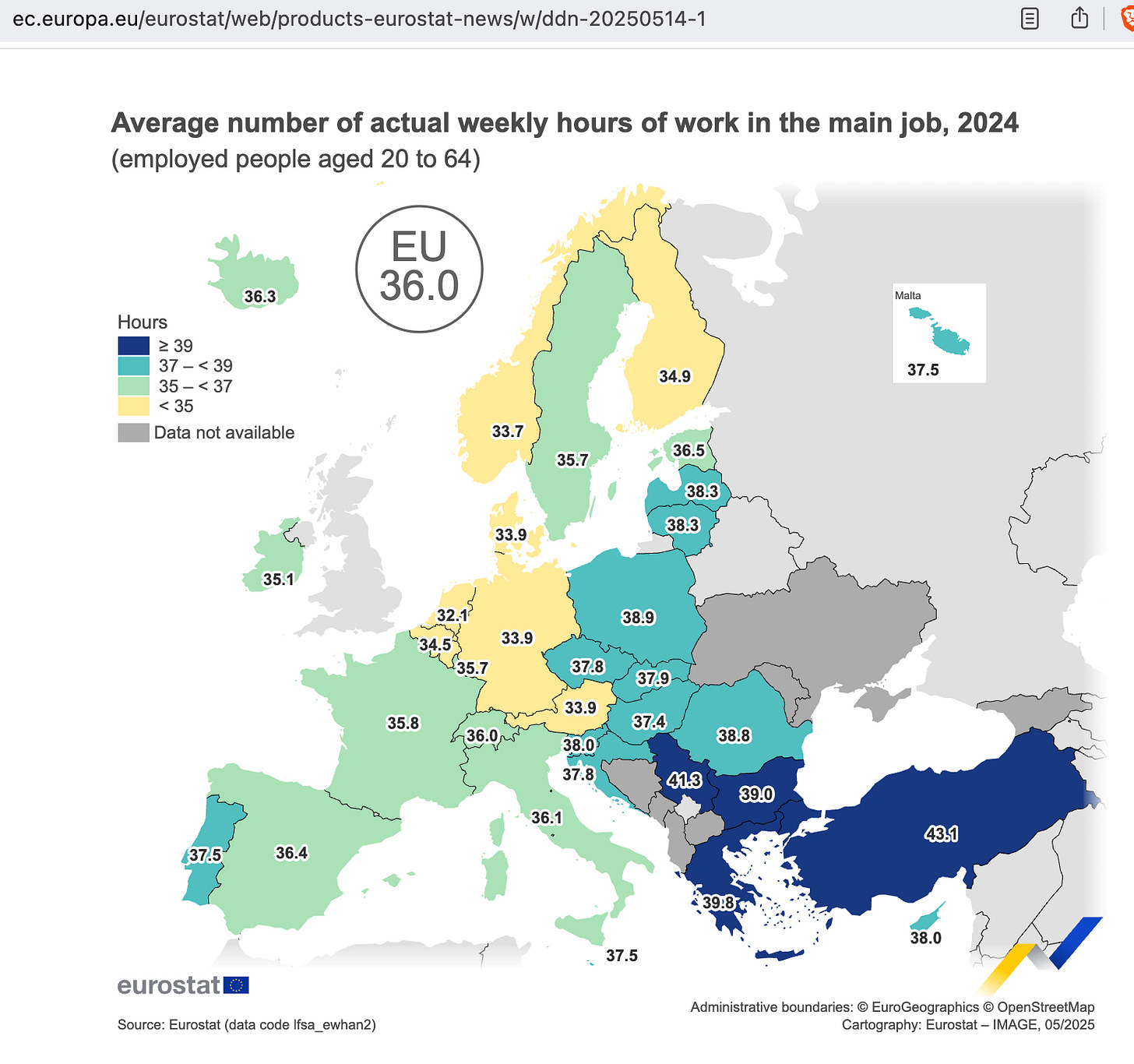 A closer look at EU countries reveals notable differences. In 2024, the longest working weeks were recorded in Greece (39.8 hours), Bulgaria (39.0), Poland (38.9) and Romania (38.8). By contrast, the Netherlands had the shortest working week (32.1 hours), followed by Denmark, Germany and Austria (each 33.9).