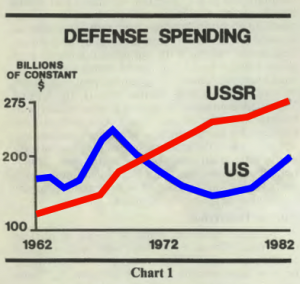 You often hear that the United States and the Soviet Union are in an arms race. The truth is that while the Soviet Union has raced, we have not. As you can see from this blue US line in constant dollars our defense spending in the 1960s went up because of Vietnam and then it went downward through much of the 1970s. Now, follow the red line, which is Soviet spending. It has gone up and up and up.” …