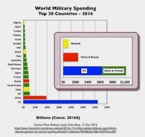 Add to the US defense budget the contributions of its allies and close friends and the spending balance in favor the US and its allies to that of Russia alone becomes an astounding 21 to 1! Even if Russia could trust China to be a reliable ally — which it can’t — the current spending imbalance is over four to one in favor of the US and its allies on the one hand and Russia and China on the other.