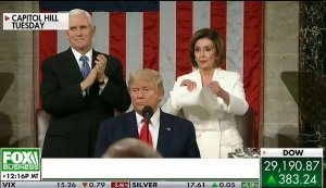All of which is to say, Pelosi is ahead on points. But on Tuesday night, she lost ground — first with her failure to include the ordinary salutation of respect for the office — “high privilege and distinct honor” — in introducing Trump; and then second, and more flagrantly, with her ostentatious ripping up of the State of the Union text, not once but twice, even as Trump was standing at the podium, basking in Republican cheers.