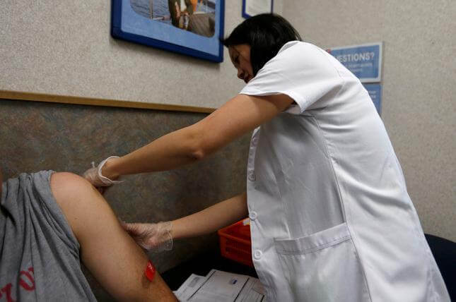 A pharmacist administers an MMR vaccine to a man at a Walgreens in San Jose, Calif., on Monday, Jan. 26, 2015.