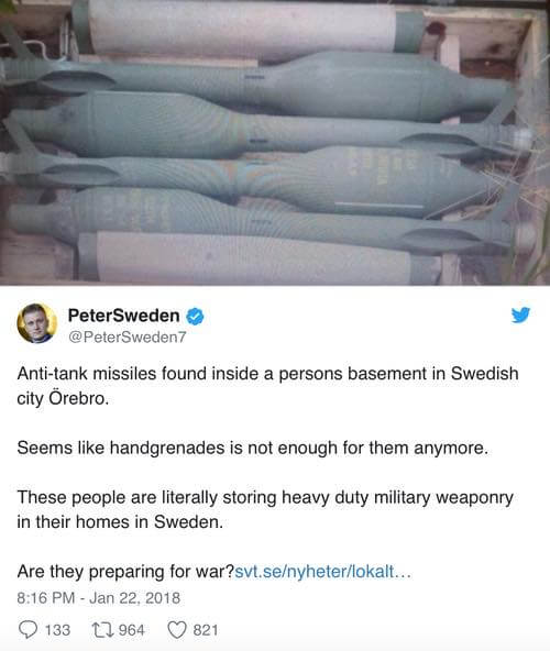 Meanwhile, increasingly powerful weapons have been turning up in Swedish neighborhoods. In 2015, anti-tank missiles were found in a basement of a 36-year-old man suspected of smuggling guns from his brothers in Bosnia into the Swedish no-go zone of Örebro – considered an “especially vulnerable area” according to a 2017 police report.