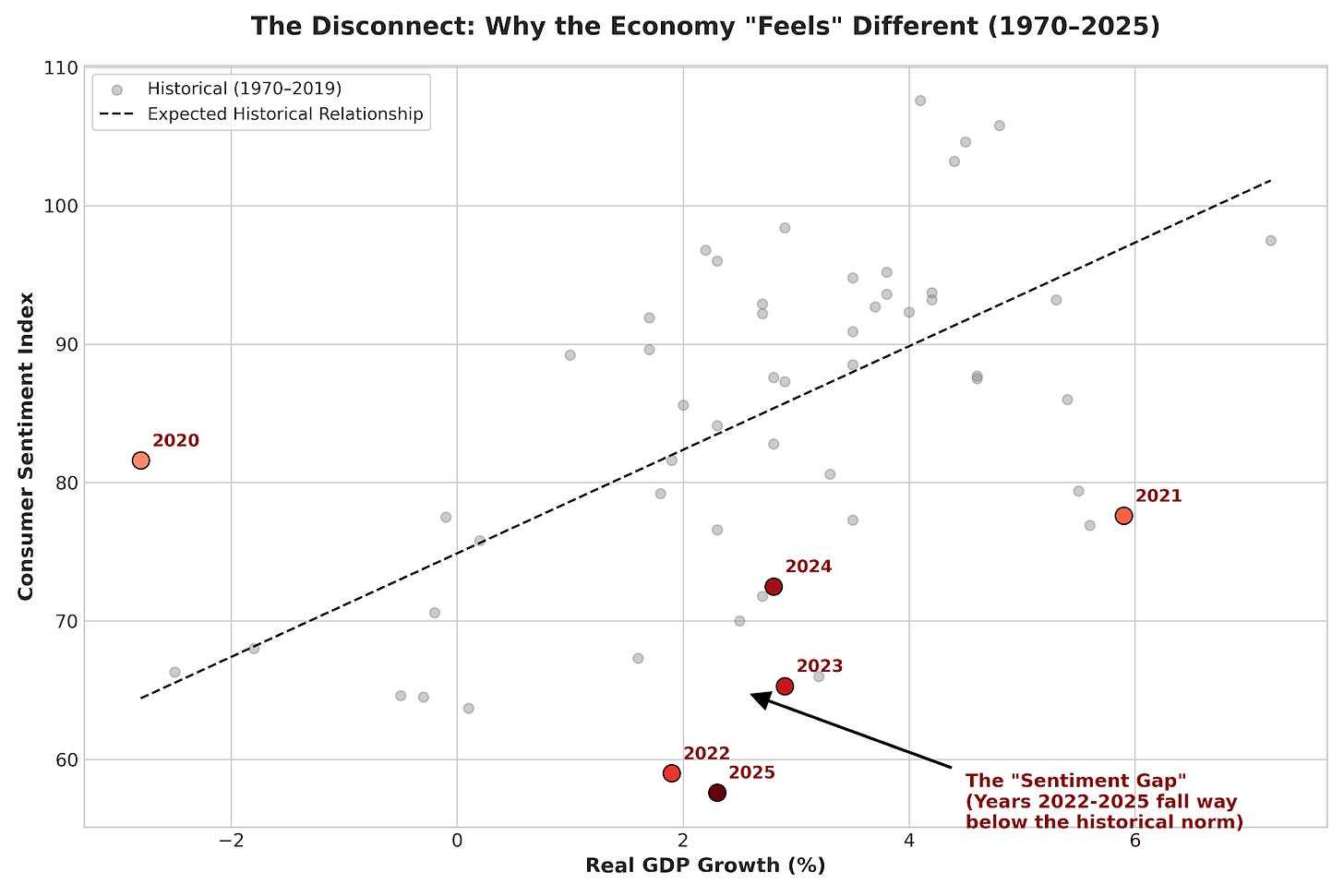If you look not at whether sentiment is correlated with growth, but at absolute levels, the situation is even more clear. Growth has been pretty good from 2021-2025, but the public is really mad.
