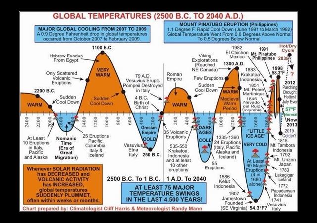 The Globe’s WOBBLE (there is NOT a stable Spin on/of our Axis), Solar Activity (Spots, Flares), CYCLES (again, REAL SCIENCE STUDIES chart shown above about said Cycles over countless years), are what REAL SCIENTISTS know what effect Climate! CO2, as demonstrated in Earth Crust Records (again, REAL SCIENCE) has shown plenty more CO2 in some of our Cooler Periods and less CO2 in some of our Warmer Periods…Not either Cause nor Effect!