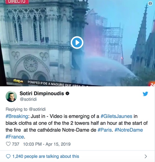 Update 2: Ever careful to watch for false-flags and conspiracy theory concerns, video is emerging of a Gilets-Jaunes in black clothes at one of the two towers half an hour after the start of the fire at Notre-Dame…