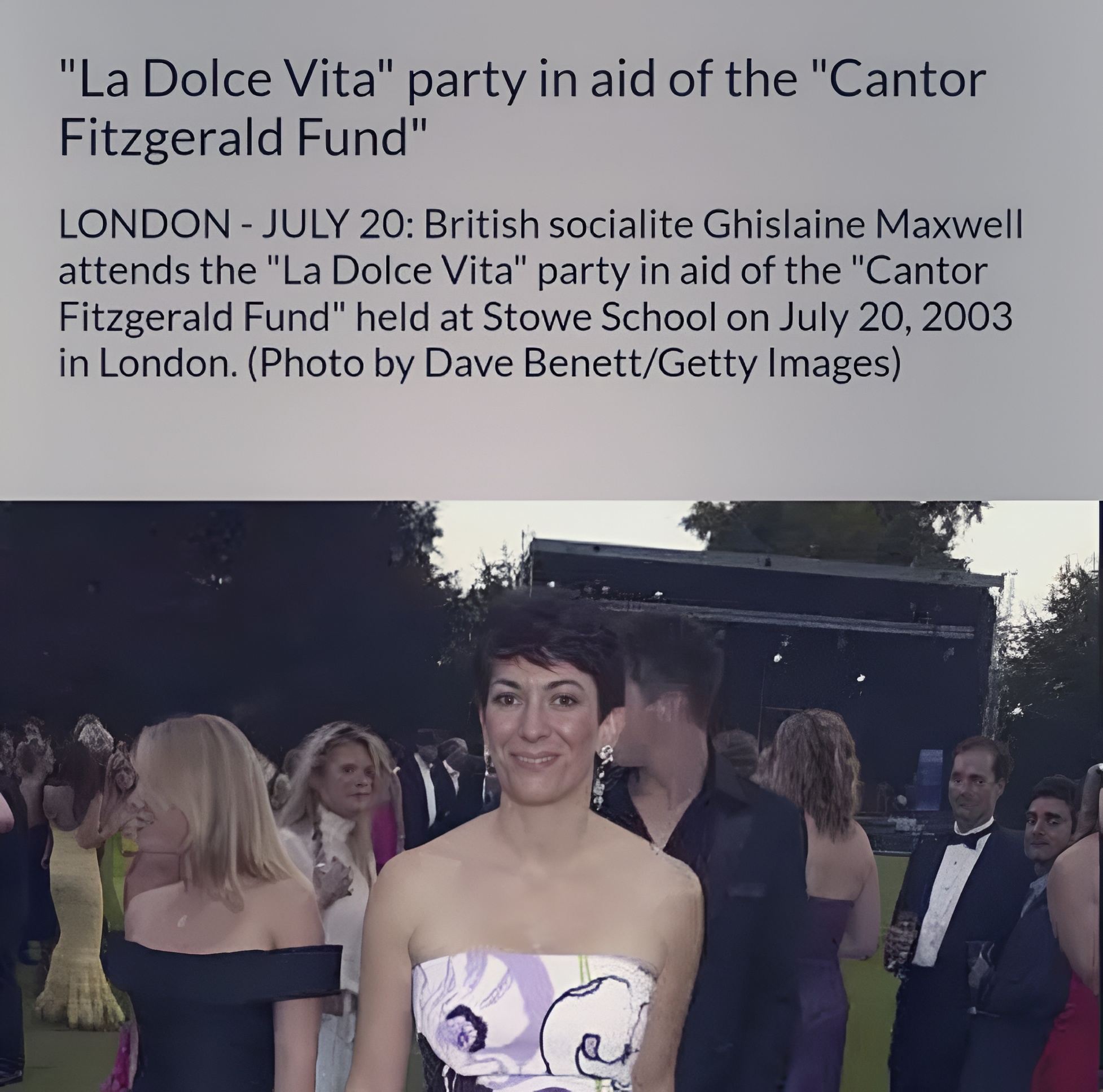 IMAGE: British socialite Ghislaine Maxwell attends the “La Dolce Vita” party in aid of the “Cantor Fitzgerald Fund” held at Stowe School on July 20, 2003 in London (Source: Dave Benett/Getty Images)