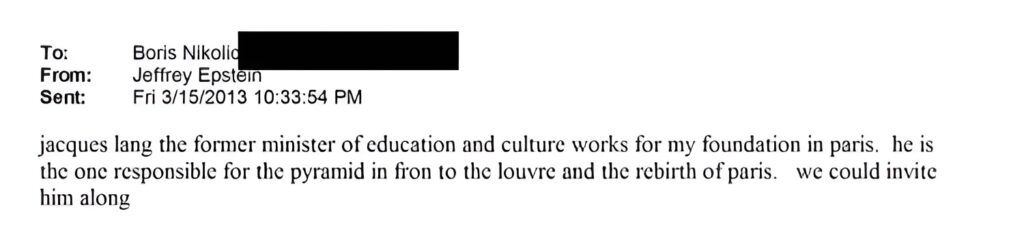 IMAGE: Jeffrey Epstein email to Boris Nikolic confirming Jack Lang worked for his Foundation in Paris (Source: EFTA01901711 | DOJ)