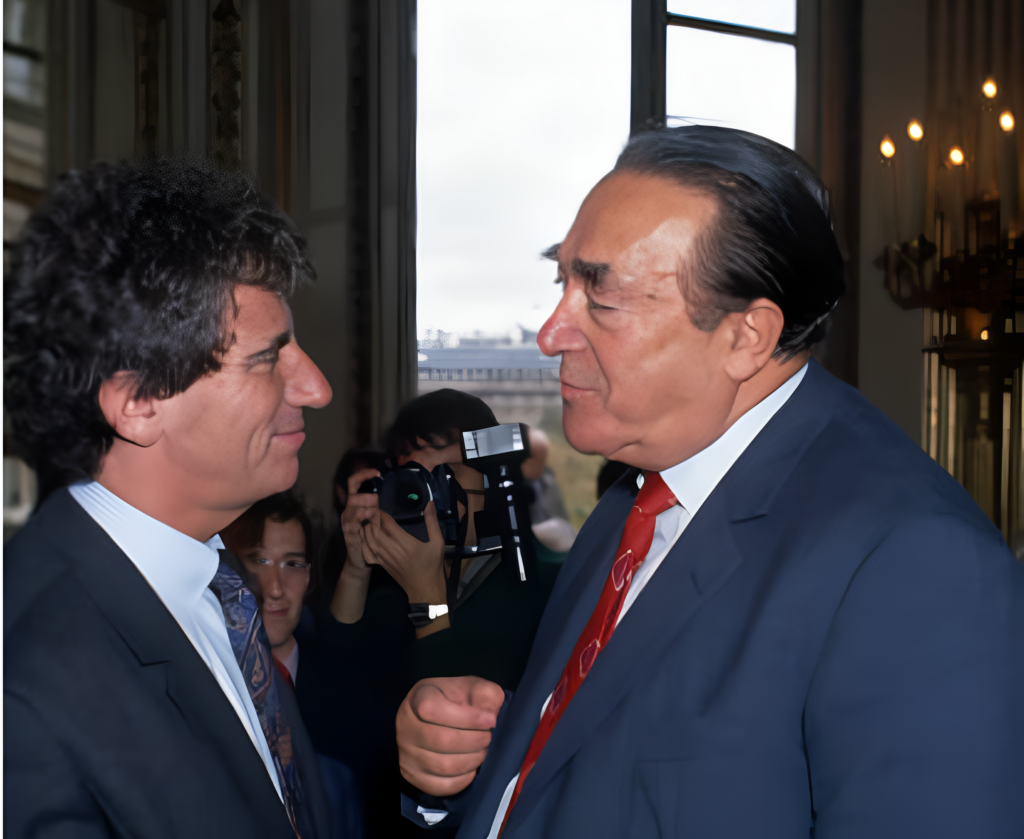 IMAGE: Robert Maxwell and Jack Lang at the Ministry of Culture for the press conference of the Mission for the Bicentennial of the French Revolution (Source: Pierre Vauthey/Sygma/Sygma via Getty Images)