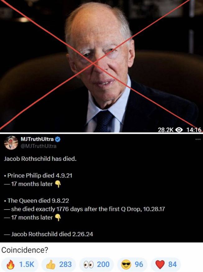 First, at the weekend a rare sighting was made down the Mall, leading to Buckingham Palace. Two black horses accompanied the King’s white horse with his colours covered in a black shroud. The King’s horse is only meant to be seen in public if he is present but he was not at the Palace at the weekend. The next day, it was announced that Lord Jacob Rothschild had died.