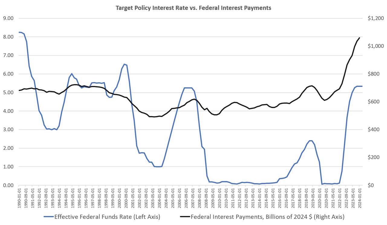 When the Fed is able to force interest rates down without fear of runaway inflation, rising debt is not much of an urgent problem. As we can see in the graph, a rapidly rising federal debt did not lead to sizable growth in interest costs in the wake of the Great Depression. That, however, was during a period of very low interest rates. Since 2022, however, Interest costs on the debt have rocketed upward as the Fed has been forced to allow interest rates to rise.