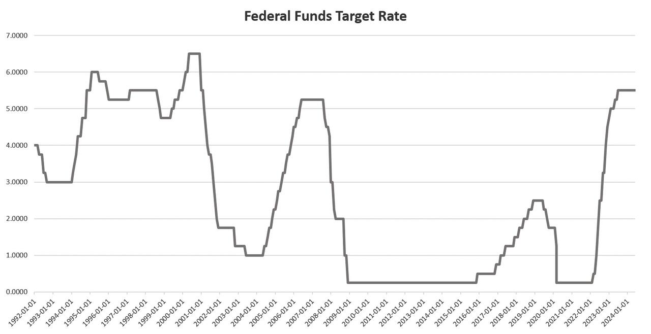 The Federal Reserve’s Federal Open Market Committee (FOMC) last week left the target policy interest rate (the federal funds rate) unchanged at 5.5 percent. The target rate has now been flat at 5.5 percent since July of 2023—as the Fed waits and hopes that everything will turn out fine. In his prepared remarks at Wednesday’s FOMC press conference, Powell continued with the soothing message he has generally employed at these press conferences over the past year. The general message has been one of moderate but sustained growth, and an economy marked by “strong” employment trends and moderating inflation.