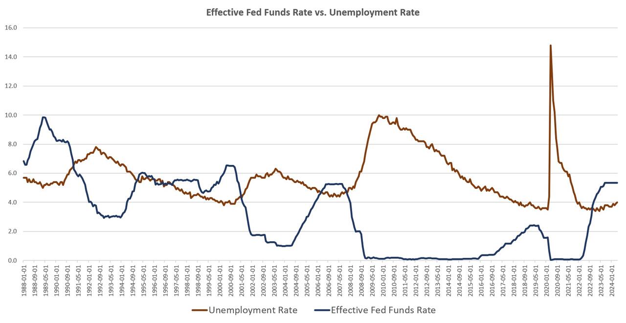 That’s not what happens in real life, though. Note, for example, that over the past 30-plus years, that Fed rate cuts did not cap off a “soft landing,” but actually preceded the most vigorous period of job losses. As can be seen in the graph, cuts to the federal funds rate come several months before sizable increases in the unemployment rate. Sharp rate cuts began in 1990, for example, and the 1991 recession soon followed. Similarly, the Fed began to cut rates in late 2000, and then the unemployment rate soon accelerated upward. This again happened in 2007 when unemployment began to mount shortly after Fed rate cuts.