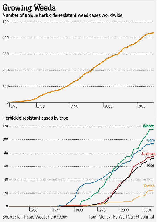 It’s a case of typical evolutionary processes: A farmer sprays her field with an herbicide, most of the weeds die, a few that are best adapted for the herbicide will live on and reproduce. After repeated herbicide use, these super weeds can actually come to dominate the weed population. Weeds have evolved to be resistant to herbicide after herbicide, starting with synthetic auxins, then triazines, then ACCase inhibitors, then ALS inhibitors and now glyphosate, the main ingredient in Monsanto’s Roundup, according to Director of the International Survey of Herbicide-Resistant Weeds Ian Heap, who helps run Weedscience.com, the central repository for scientifically backed, peer-reviewed herbicide-resistance cases.