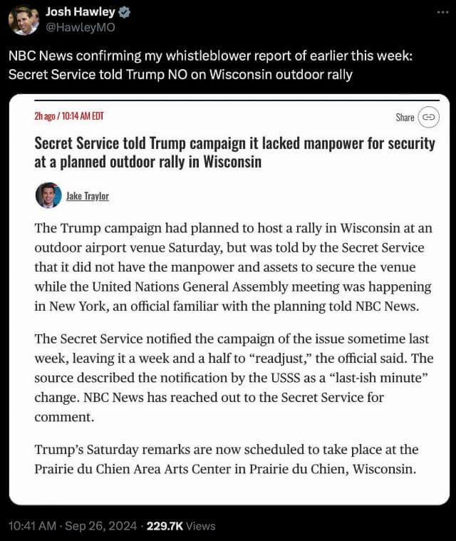 Now we learn the SS is “protecting” Trump by keeping him from campaigning in battleground states like Wisconsin:
