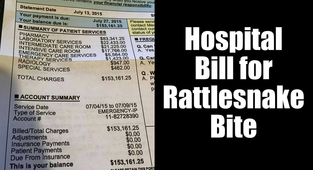 This unfortunate person obviously suffered from two snake bites [bill pictured above]. One from an actual snake and the other a financial bite from the snakes wearing white coats and the power behind them, the financial scammers sporting expensive suits, Rolex watches, and a Mercedes or two.