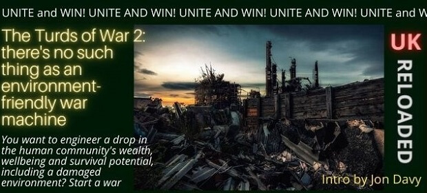 As there is no such thing as a solar powered bomber, wind-powered tanks and so forth, we are faced the fact that the war “industry” is the worst polluter known to Man.