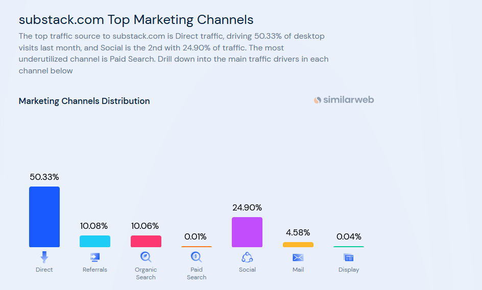 Which could be a major problem for writers who have chosen Substack as their distribution and marketing platform, since 25% of Substack traffic comes from Social Media…